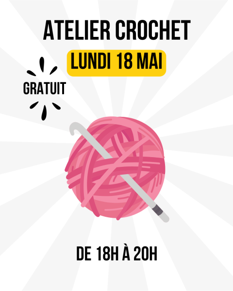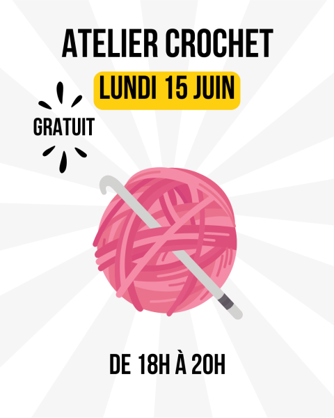 Atelier crochet dans lequel vous pourrez décider ensemble d'une création à réaliser (sac, peluche, vêtement...)